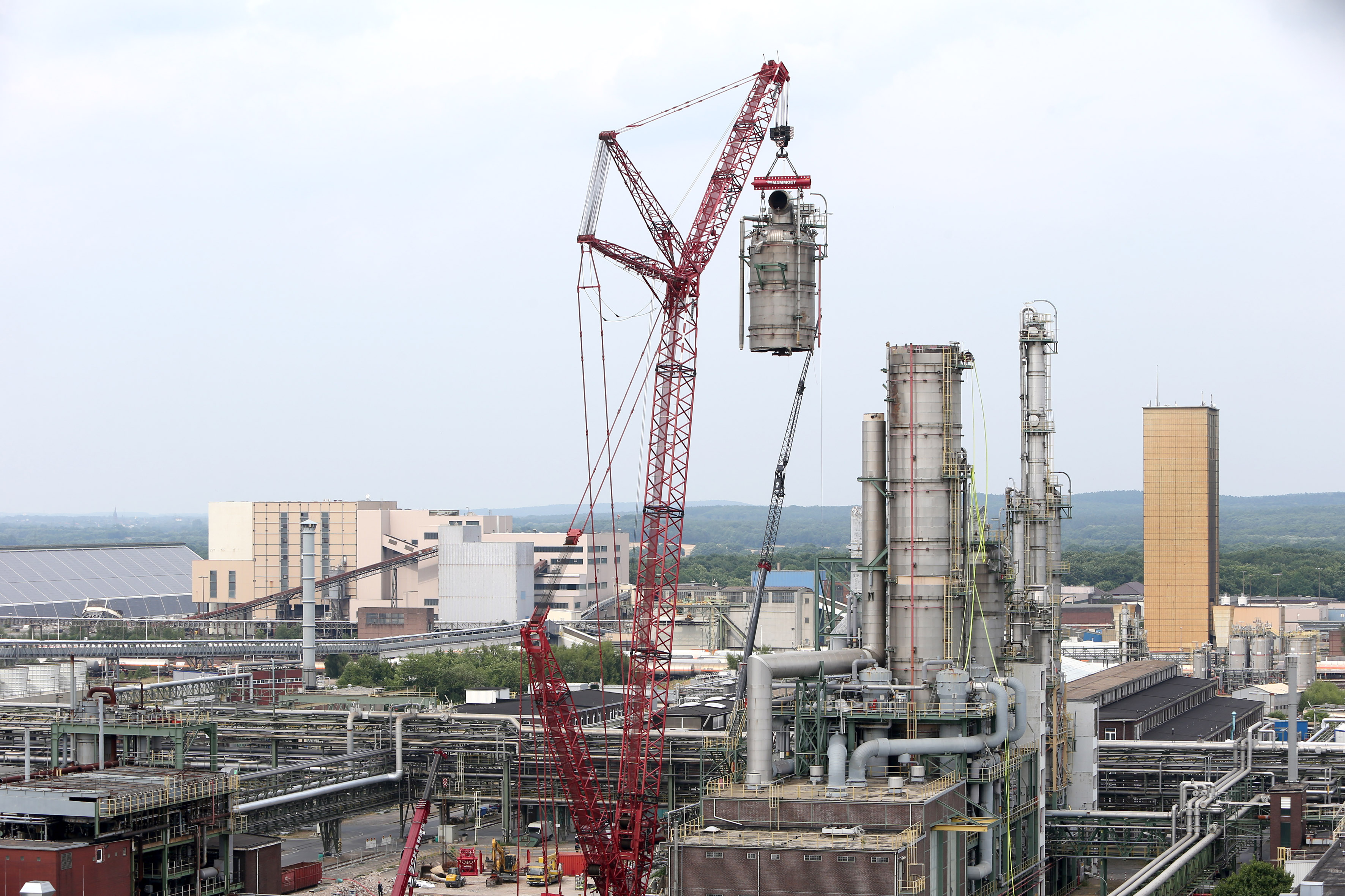 Mit einem Kran wurde das obere Viertel der Kolonne an vier Seilen aus der Anlage herausgehoben. Das Teilstück wiegt zirka 150 Tonnen, die Seile haben eine Traglast von jeweils 150 Tonnen.