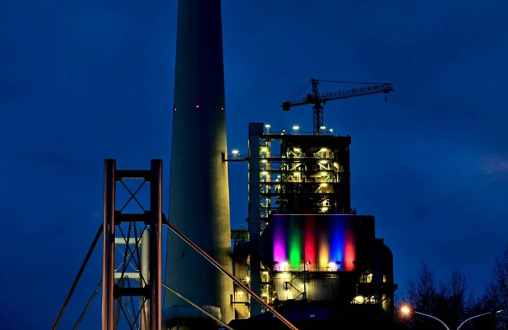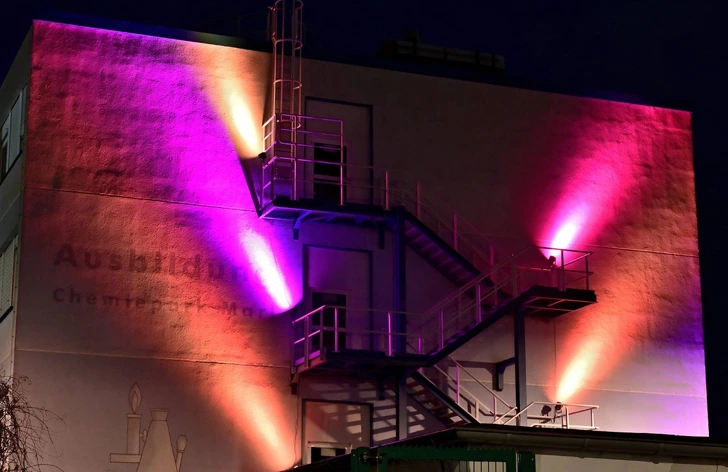 Als Zeichen gegen Rassismus und Fremdenfeindlichkeit sind während der internationalen Wochen gegen Rassismus vier Gebäude im Chemiepark Marl bunt beleuchtet.