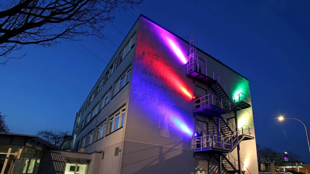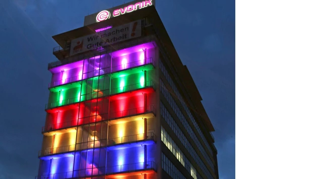 Gebäude, die innerhalb der letzten Jahre beleuchtet wurden und auch dieses Jahr wieder ein buntes Zeichen setzen: Die Evonik Creavis GmbH.