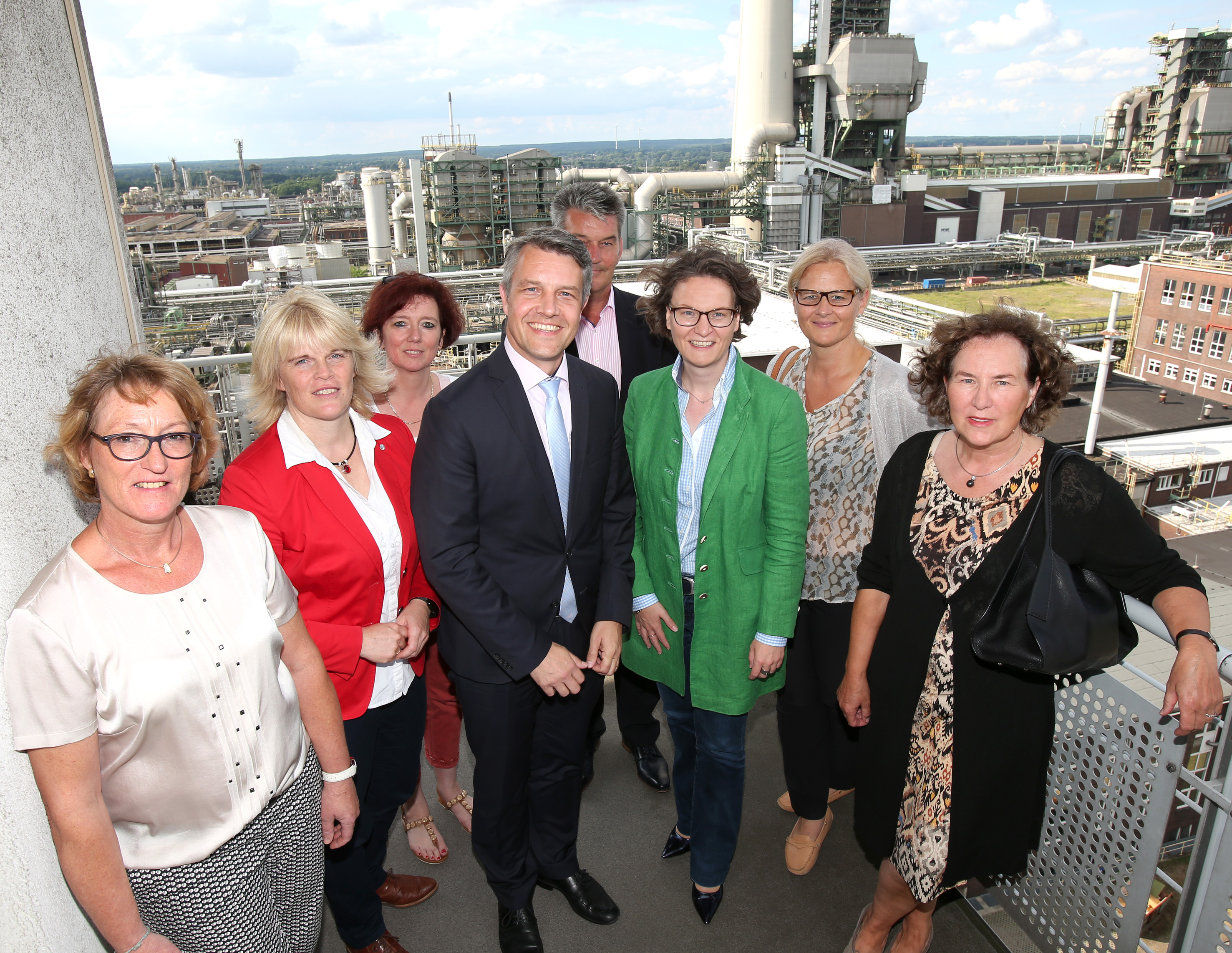 Bei der anschließenden Rundfahrt durch den Chemiepark erfuhren die Frauen viel über die Verbundproduktion der rund hundert Produktionsanlagen verschiedener Unternehmen am Standort. Der abschließende Blick vom Hochhaus verdeutlichte die Dimension des mehr als sechs Quadratkilometer großen Werksgeländes, mit 55 Kilometern Straßen-, 100 Kilometern Schienen- und 1.200 Kilometern Rohrleitungsnetz. Die Damen zeigten sich beeindruckt von der vorgehaltenen Infrastruktur, der Koordination der Produktionsprozesse und der effizienten Logistik im Chemiepark.