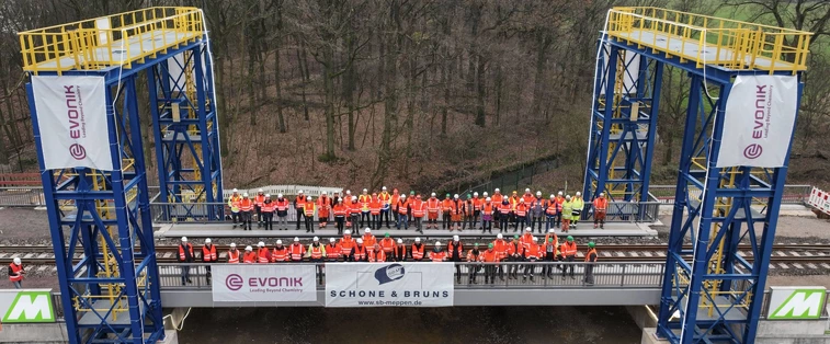 Zum Hintergrund: Der Chemiepark Marl hat am Silvertbach einen Ersatzneubau der Eisenbahnüberführung durchgeführt. Damit investiert Chemiepark-Betreiber Evonik in die Instandhaltung der für den Marler Standort wichtigen Brücke. Die Maßnahmen umfassten den Neubau einer Eisenbahnbrücke während des Weiterbetriebs, den Rückbau des vorhandenen Tunnelbauwerks sowie die Modellierung der Böschung und des Bachlaufs.