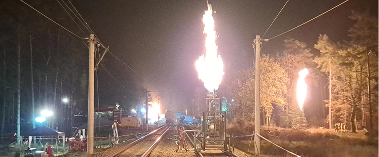 In der Folge werden die Kesselwagen für eine sichere Kranung und den Abtransport vorbeitet und das Innenvolumen mit Stickstoff gespült, so dass keine brennbare Atmosphäre mehr entstehen kann.