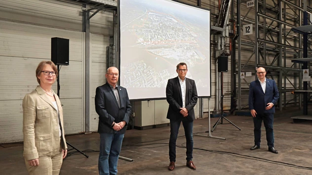 Stefan Kuczera, Beigeordneter des Regionalverbands Ruhr (rechts), wurde begrüßt von Alexandra Boy, Leiterin der Kommunikation Chemiepark Marl, Herne, Witten (links), Michael Bach, Allgemeiner Vertreter des Bürgermeisters der Stadt Marl (z.v.l.), und Thomas Middelmann, Bereichsleiter der RAG MI.