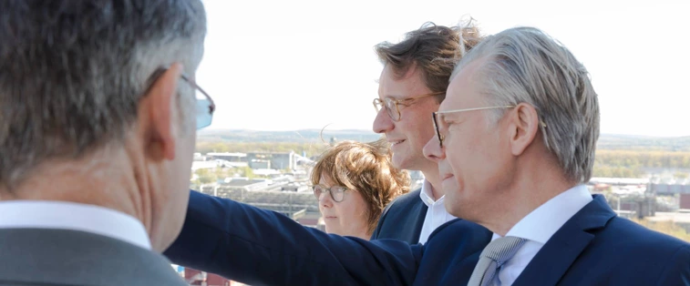 Neben Standortleiter Bernd Vendt empfingen mit Energie-Leiter Heiko Mennerich sowie Gerd Ribbeheger und Ali Simsir vom Betriebsrat weitere Chemiepark-Verantwortliche den Ministerpräsidenten. Nach einem intensiven Austausch über Evonik, den Chemiepark Marl und die aktuelle Energieversorgungssituation ging es unter regem Interesse einiger lokaler und überregionaler Medienvertreter auch nochmal hinauf in den neunten Stock des ehemaligen Forschungshochhauses. Hier gab es bei gutem Wetter nicht nur Statements für die Journalisten, vielmehr ist das Hochhaus ein immer wieder gerne genutzter Aussichtspunkt, um einen Überblick über das gesamte Areal des Chemieparks mitsamt seiner Kohle- und Gas- und Dampfturbinenkraftwerke zu bekommen.