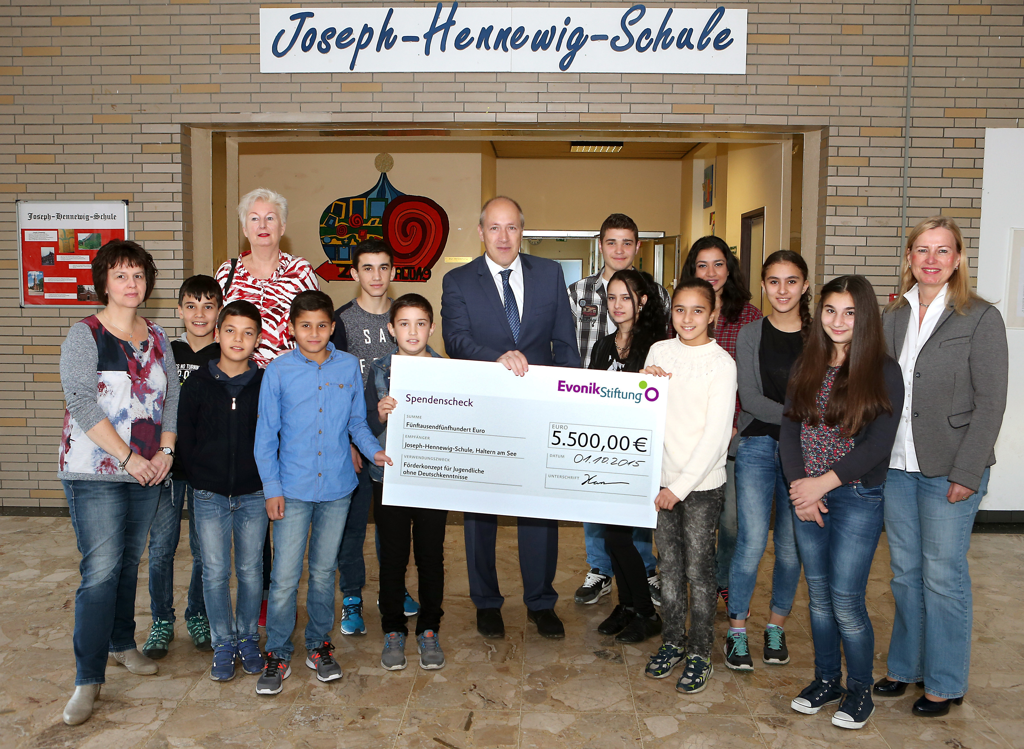 Empfänger ist der Förderverein der Joseph-Hennewig-Schule in Haltern am See. „Wir sind von dem Förderkonzept für Seiteneinsteiger ohne Deutschkenntnisse überzeugt“, so Dr. Martin Harrmann, Leiter PI-Technik, der einen symbolischen Scheck im Namen seiner Kollegen überreichte. Und im Namen von der Evonik-Stiftung: Die Spendenaktion kam so gut an, dass sie die die Summe verdoppelte.