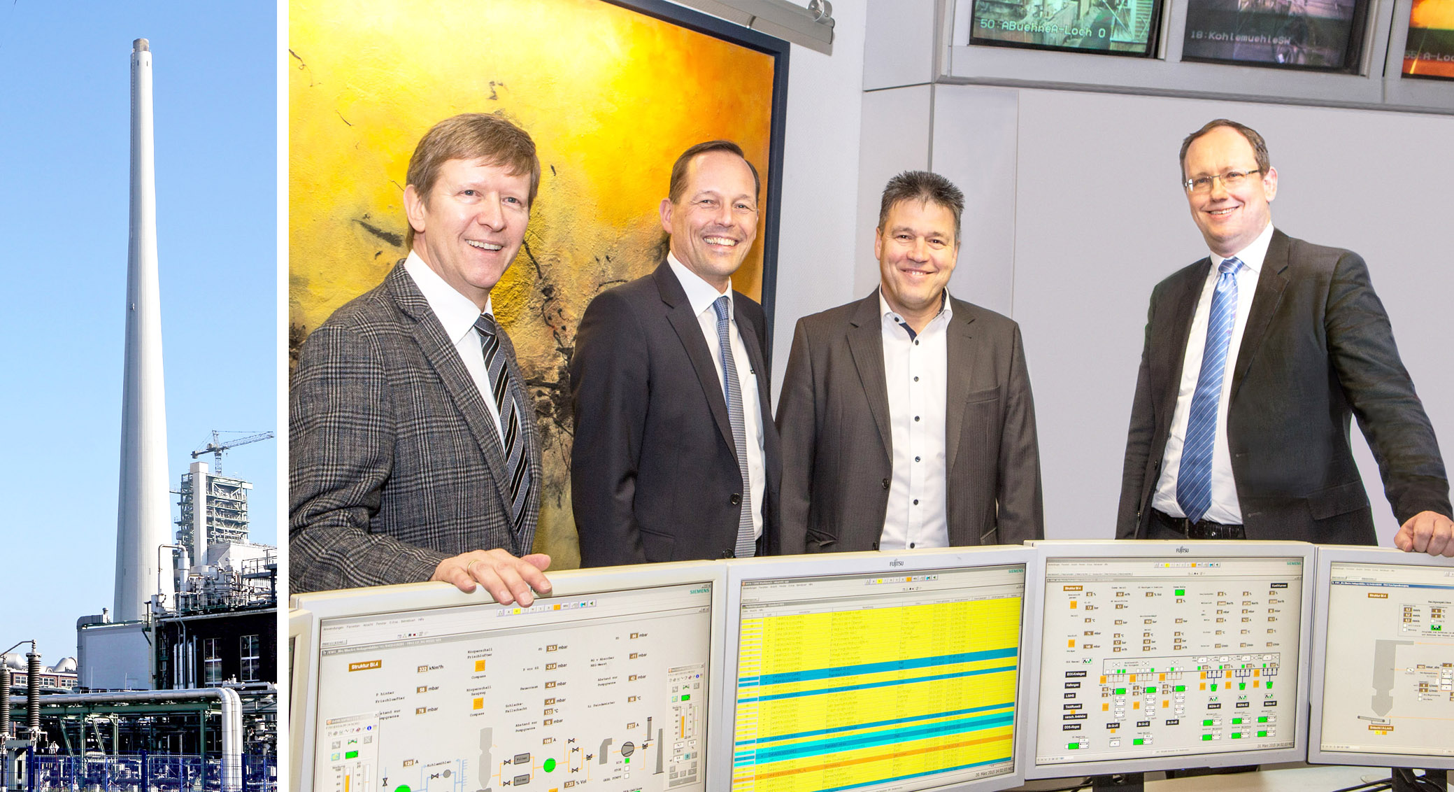 Thomas Wessel (2. von links) und Uwe Tigges (3.) umrahmt von Peter Kannacher, Leiter Kraftwerk 1 (links), und Andreas Steidle Leiter Energy Coordination (rechts).